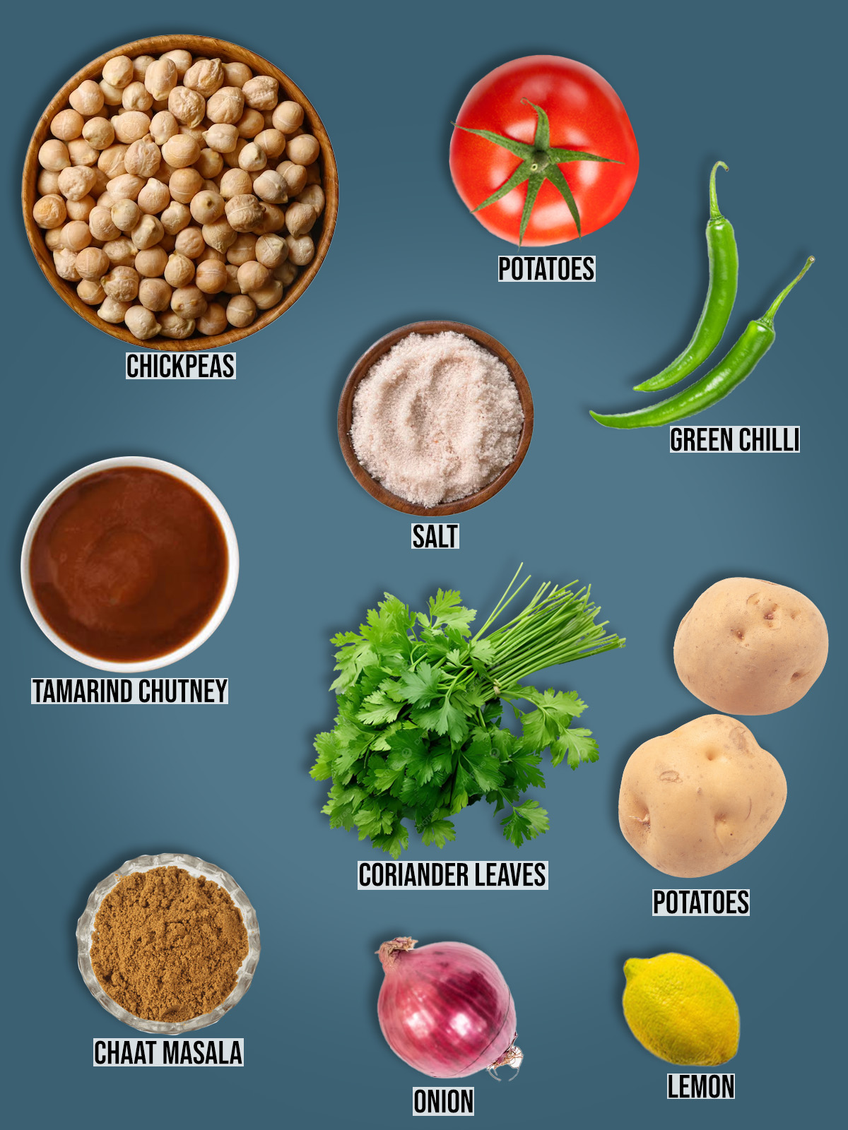 The main ingredients are boiled potatoes, chickpeas, onions, and tomatoes. In addition, green chilies, fresh coriander, chaat masala, tamarind chutney, and lemon juice bring it all together for a flavorful kick.