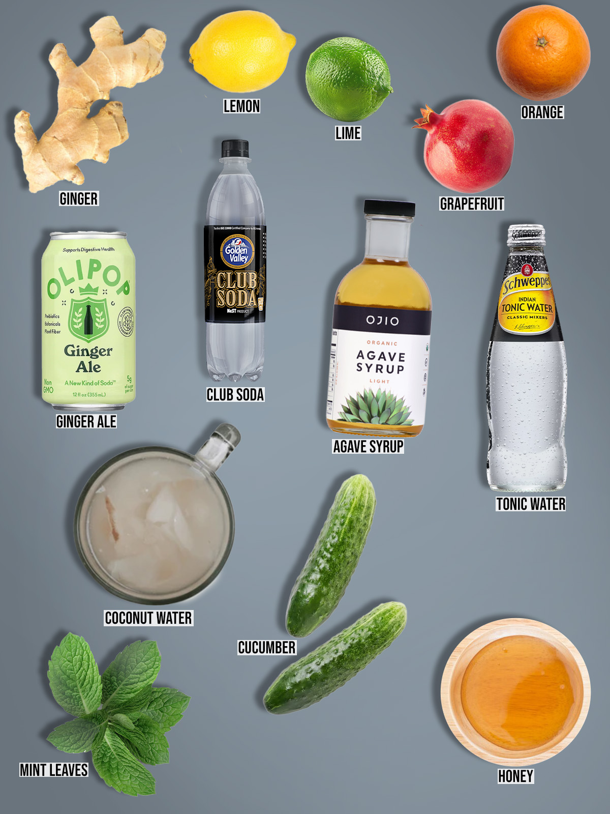 Examples include a Citrus Spritz (orange, lemon, lime with sparkling water), Tangerine Basil Fizz (tangerine juice, basil leaves, soda), or a GrapefruitGinger Sparkler (grapefruit juice, ginger, and sparkling water).