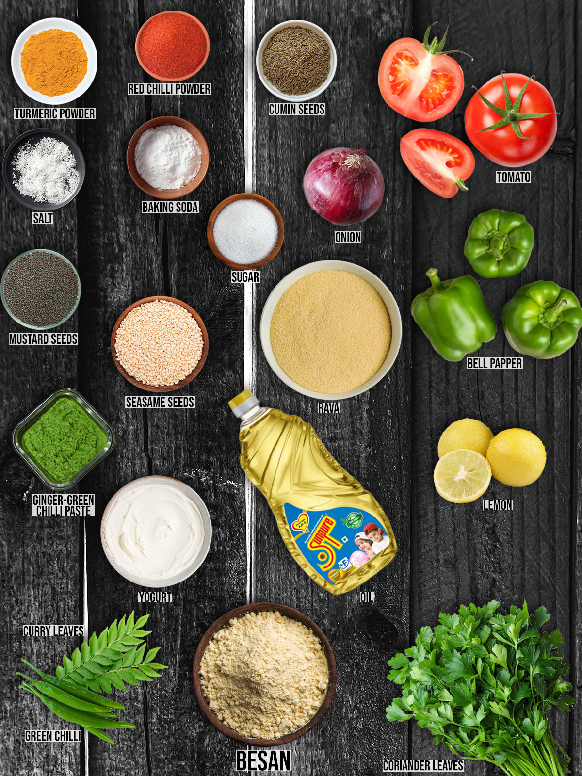 Key ingredients for Sandwich Dhokla include gram flour (besan), curd (yogurt), semolina, spices (such as turmeric and chili powder), and a filling made from vegetables like onions and tomatoes. Tempting toppings like mustard seeds, sesame seeds, and curry leaves add flavor.