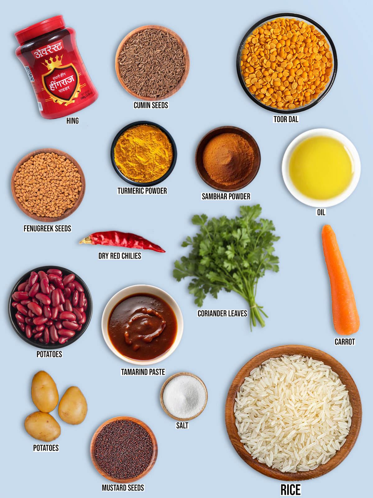 - Rice: First thing to remember, rice is the base of the dish. Not only does it provide the perfect texture, but it also soaks up the tangy and spicy sambar sauce, making it a complete meal.