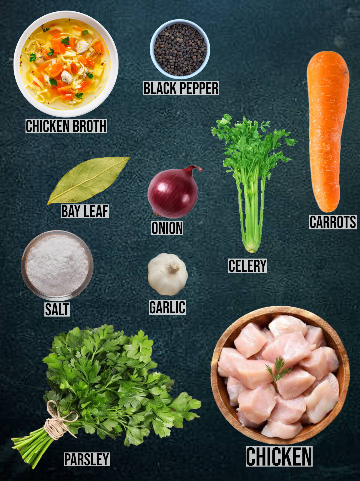 The main ingredients usually include chicken (breast or thighs), vegetables (like carrots, celery, and onions), chicken broth, and seasonings (such as salt and pepper).