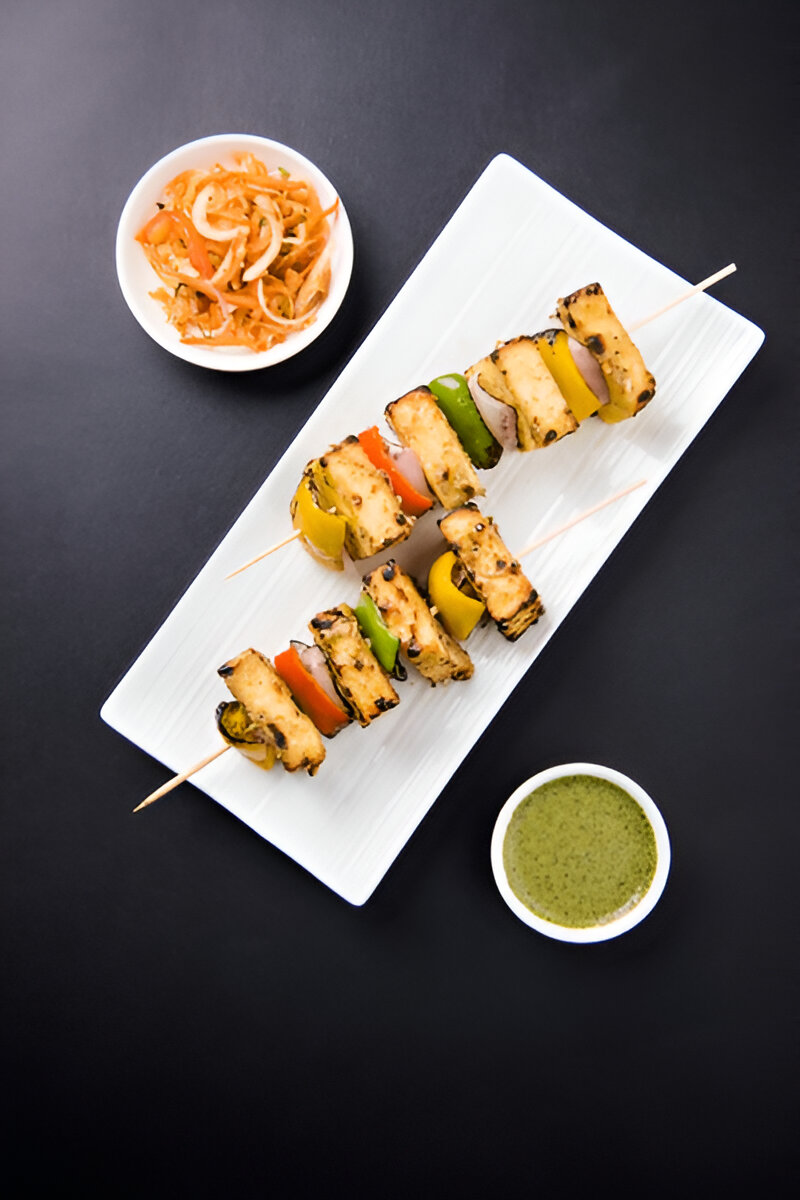Skewer the marinated paneer with onions & capsicum. Grill or air-fry until golden edges and smoky flavor appear.