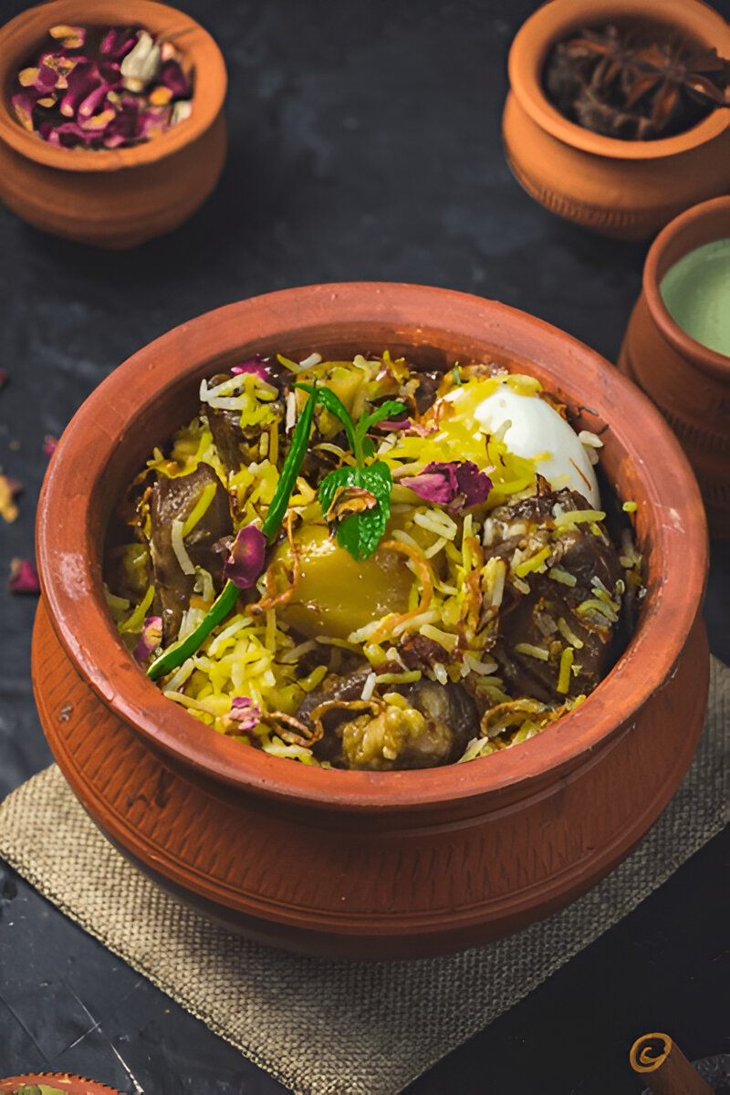 Basmati rice Marinated mutton Onions Tomatoes Ginger-garlic paste Yogurt Biryani spices Fresh mint Coriander Ghee Saffron