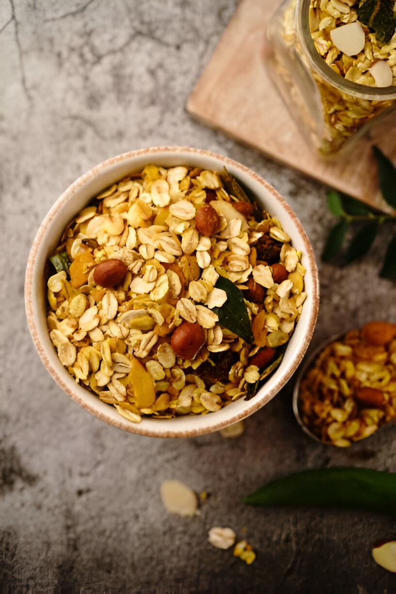 Looking for a healthy munch option? Try this Oats Chivda – a crunchy, roasted trail mix made with oats and spices!